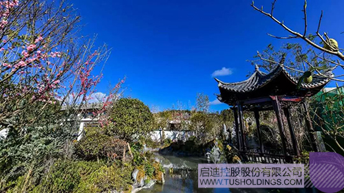 “若水池”畔花香染襟,魚戲幽池碧波蕩漾;“騰越亭”內好友歡聚,淺嘗清酌花間囈語;看庭前花開,悅水霧朦朧,心隨風,夢隨已。