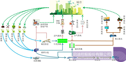 啟迪桑德針對各類城市濕垃圾的特點,成功的開發了“垃圾干濕分離”、“干法/濕法厭氧”、“沼渣處理”、“沼氣凈化與利用”、“沼液處理”等多項核心技術,建立了城市濕垃圾處置與資源化利用綜合解決方案。通過處理,城市濕垃圾能夠被轉化為沼氣、沼渣、沼液和殘渣等幾種產品。沼氣可作為清潔能源被廣泛利用,如制取壓縮天然氣、熱電聯產或作為直接作為燃氣等。沼渣和沼液可以作為有機肥,回用于市政綠地及園林。殘渣可外送垃圾焚燒廠處置,產生電能。