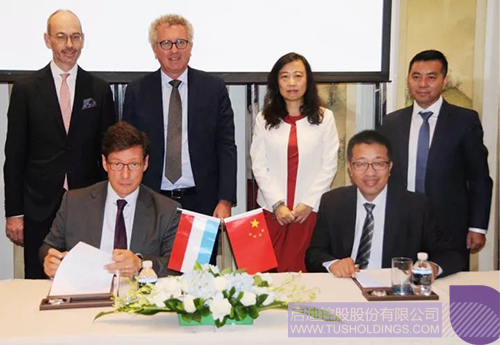 后排左一:盧森堡駐中國大使 Marc Pierre HüBSCH先生;左二:盧森堡財長Pierre Gramegna先生;左三:啟迪控股總裁袁桅女士;左四:啟迪科服副總裁王德祥博士;前排左:盧森堡LFF總裁Nicolas Mackel先生;前排右:啟迪科服董事長兼總裁王書貴先生