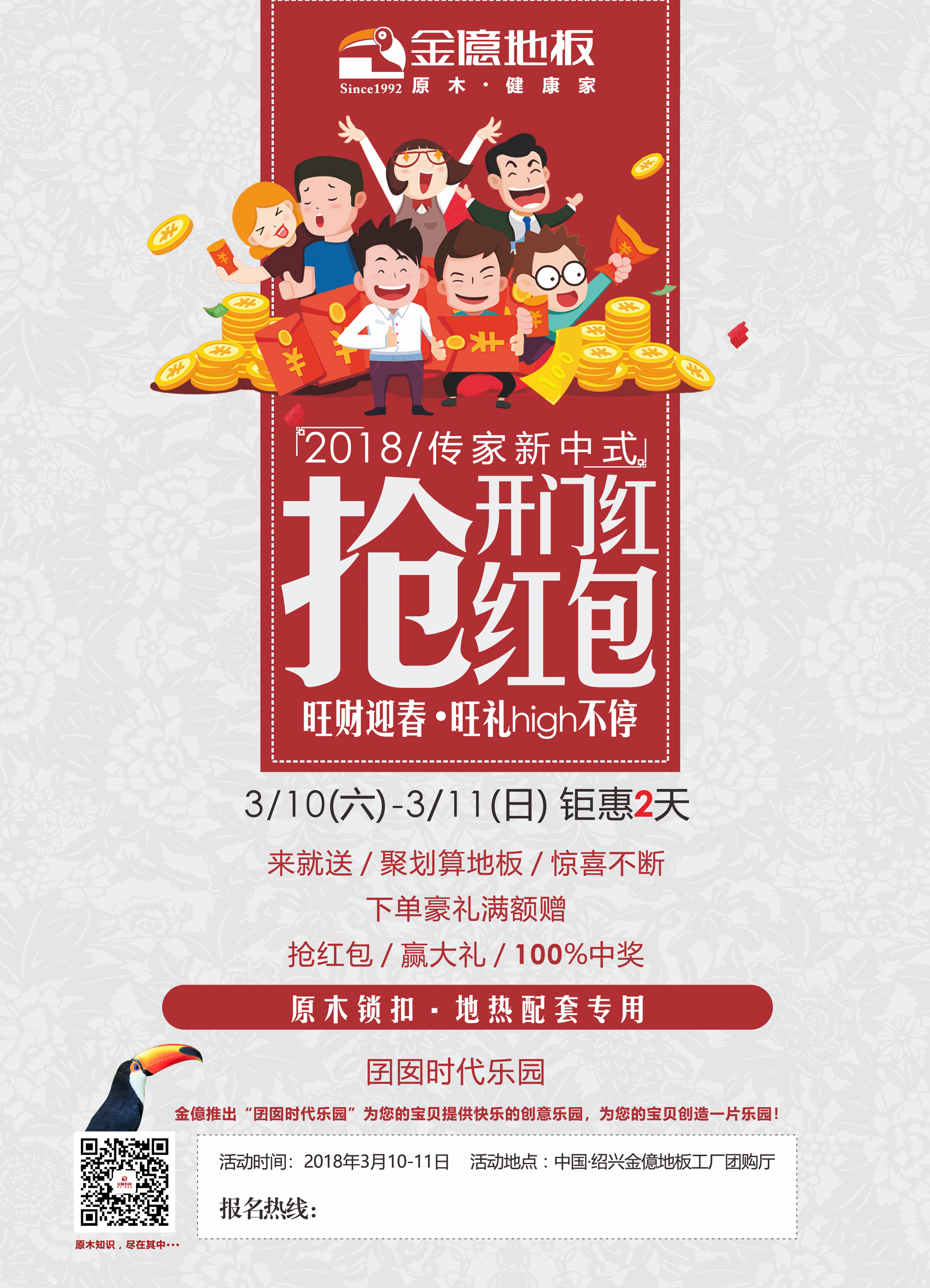 時間一晃而過,過完了熱熱鬧鬧的春節,我們又迎來了新的一年工作之中。2018年,擼起袖子,加油干! 3月金億地板工廠團購活動 “開門紅-搶紅包 旺財迎春,旺禮high不停” 如約而至。