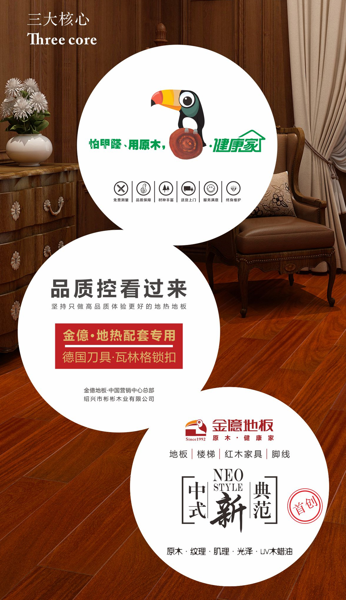 “金億地板”品牌創(chuàng)始于1992年,是“原木健康家”理念的開創(chuàng)者,在業(yè)內(nèi)首創(chuàng)新中式風(fēng)格典范,引爆消費(fèi)新趨勢,更是健康原木人字拼產(chǎn)品行業(yè)創(chuàng)新品牌。金億上世紀(jì)90年代率先走出國門,創(chuàng)造了無數(shù)的輝煌成績,歷經(jīng)近30年的發(fā)展,抒寫了中國企業(yè)國際化經(jīng)營的成功篇章,更是以對社會的卓然貢獻(xiàn),贏得諸多榮譽(yù),譜寫了行業(yè)翹楚篇章。